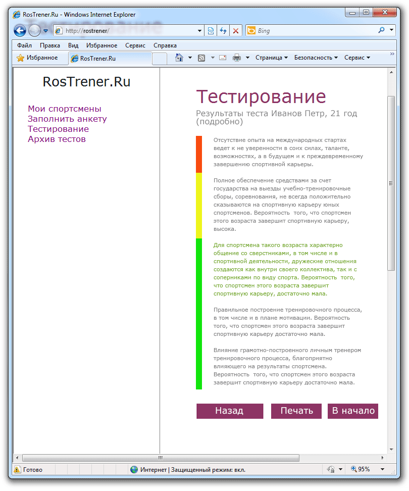 Итогом тестирования является общий прогноз вероятности реализации спортивной карьеры спортсмена, отраженный в виде «светофора прогноза». Наличие соответствующего цвета – «красный», желтый» или «зеленый» говорит соответственно о критической, нейтральной и благоприятной ситуации, в которой находится спортсмен. Сумма, набранная в результате ответов на вопросы в каждом блоке и «зажигает» соответствующий сигнал светофора. Цвета отражаются как в каждом блоке в отдельности, так и итоговым цветом общего результата тестирования.